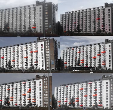The potential here is to create a score that is both architectural and temporal, mapping human presence and environmental conditions into a visual rhythm. Over time, the changes in the awnings could form a living notation system, capturing the building’s daily and seasonal variations. In this sense, the façade becomes a canvas of improvised decisions made by its inhabitants, translated into musical form.