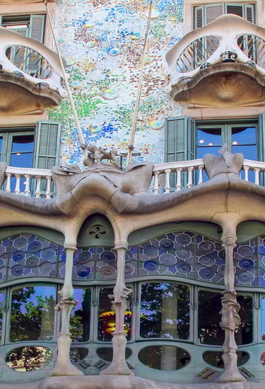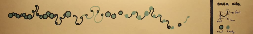 The Casa Milà piece, by contrast, takes its cue from Gaudí’s fluid and ornamental design vocabulary. Here the notation moves away from strict timing and instead emphasizes ornaments, curves, and accelerandos, echoing the building’s organic facades and continuous surfaces. In this sense, the piece is less about exact duration and more about shaping sound through flow and transformation.