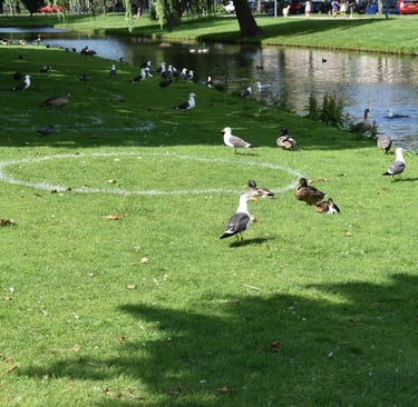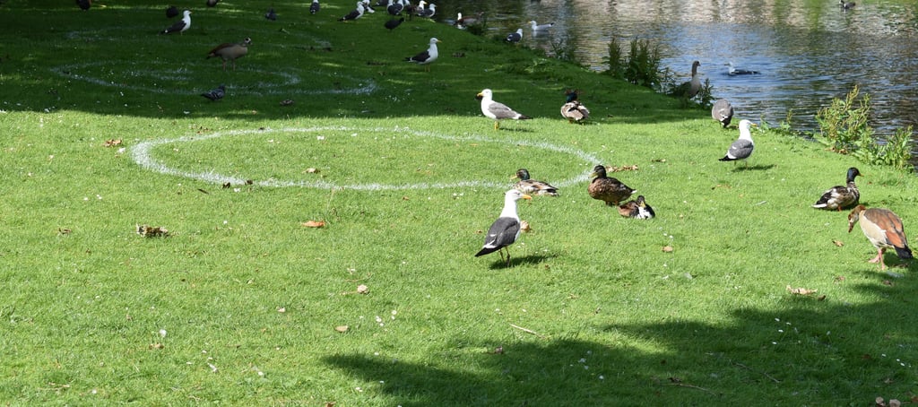 Along the Beukelsdijk, there is a long stretched park area for people to enjoy. As the COVID regulations of social distancing started, the municipality drew circles on the glass with white spray paint so that there wouldn't be gatherings of more than an unhealthy amount of people. The seagulls and ducks did not care about this at all of course.