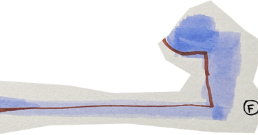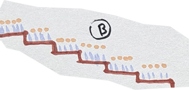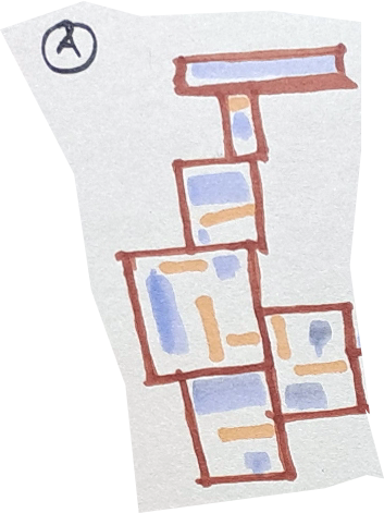 Hall 6. The observer (red) has to climb up, slowing down. Bright sunlight (blue) divided very weakly by the linear structural window supports (yellow).