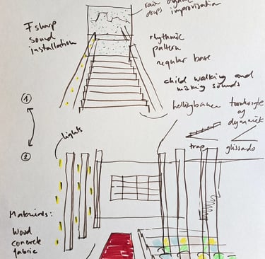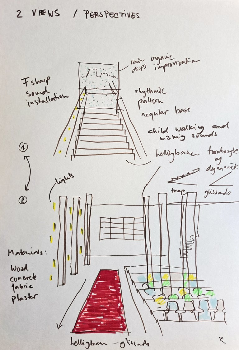 The hall cramping in as you reach the top while the angled pillars creating a regularity, the ramp as a glissando technique, F# sound of the ventilation system as a drone sound on the bass, raindrops on the windows as a pizzicato technique, a child as an observer, moving around and making curious sounds.