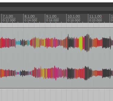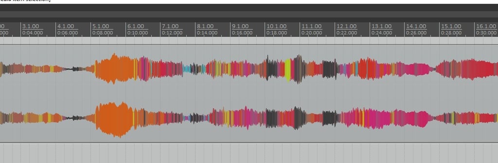 The spectrograph function in Reaper allows the user to see pitch changes as color, layered above the usual waveforms. Originally, this function was designed as a practical tool: to help distinguish between percussion instruments without pitch and pitched instruments. It is remarkably effective, since at a glance one can immediately identify which track is a drum track and which belongs to a melodic instrument.
