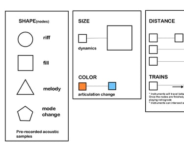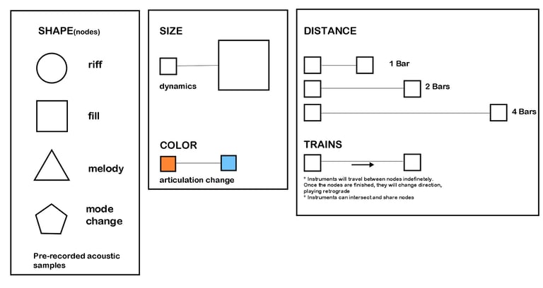 Nodes sit on a 1–2–4–8 grid, tied to bars at the chosen BPM and meter. Each node holds a WAV file, and its size determines dynamics. If a sample doesn’t fit the grid, the software stretches, chops, or loops it. End nodes stop a train completely, while future updates will allow resets or delays.
